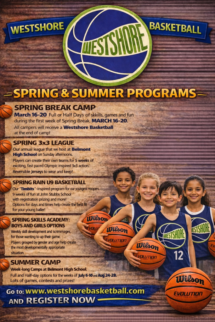 Westshore Basketball offers fun and immersive skills developments camps every Spring, Summer, and Winter and are available for athletes of every skill level from Grade 2 – Grade 8. Daily activities include skill development, team building, physical training and game play. Players will develop confidence, coordination and cooperation in a fun, fast-paced environment.