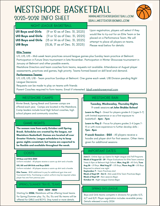 Westshore Basketball is pleased to offer a wide variety of programs that are available to athletes from the ages of 5-17. Our Westshore Rain program caters to younger athletes looking to get into the sport of basketball, while our Night League program gives older athletes an option for recreational and competitive basketball in competition with other Victoria Basketball programs.Westshore Basketball frequently operates out of Belmont Secondary, Spencer Middle School and John Stubbs.